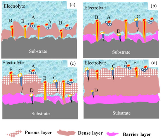 The second generation of PEO, i.e., “soft-sparking PEO”, was realized under specific AC or bipolar conditions [30,31,32,33]. The coatings usually comprised a highly porous outer layer, a relatively thick and dense intermediate layer, and a thin barrier layer [15]. Based on Hussein’s study, and considering the three-layer microstructure of these coatings, Y. L. Cheng et al. categorized the discharge observed during the soft-sparking PEO process into five types: types A, B, and C correspond to the abovementioned categorizations; type-D discharge occurs in the macropores near the inner and outer interfaces and increases the thickness of the inner layer and the merging of silicon species; and type-E discharge is relatively strong and may form pancake structures that are confined to the outer coating [34].