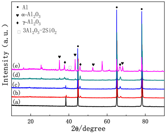 XRD patterns of PEO coatings at different stages: (a) stage I; (b) stage II; (c) stage III; (d) stage IV; (e) stage V.