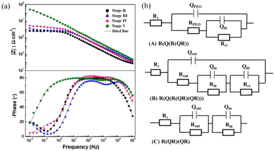 (a) Bode plots and (b) equivalent circuits of PEO coatings at different stages.