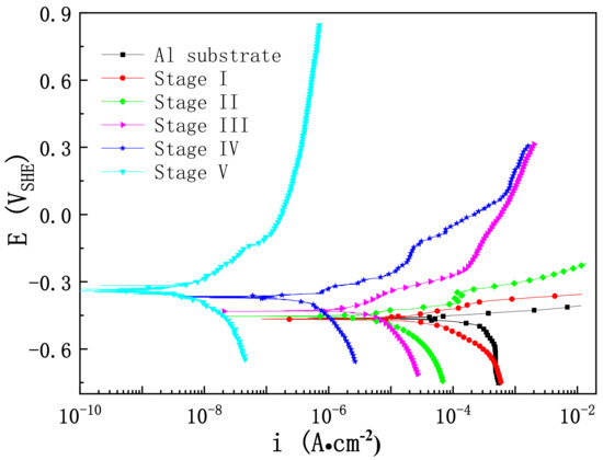 Figure 9 illustrates the potentiodynamic polarization curves of pure Al with and without a PEO coating, which we analyzed to assess the corrosion resistance of the PEO coating at different stages. Table 4 lists the corresponding electrochemical parameters obtained by the Tafel extrapolation method. According to the polarization curve, the anodic and cathodic reactions of the pure Al with a PEO coating achieved an obvious inhibition, with the prolongation of the PEO treatment duration. The self-corrosion current density (icorr) of pure Al is 1.629 × 10−4 A∙cm−2, which was decreased by an order of magnitude due to the anodic oxidation film formed on the Al in stage I. Although the porosity of the coating in stage I was lower than in stage II (as shown in Figure 10), the icorr of the coating in stage II decreased by an order of magnitude compared with the anodic oxidation coating in stage I. This was because the anodic oxidation film comprised a stacking structure, which allowed the corrosive medium to quickly reach the matrix through the gaps between layers, resulting in metal corrosion. However, the PEO coating in stage II contained many micropores. The corrosion medium had to bypass these pores, which prolonged the time it took to arrive at the matrix and reduced the contact area between the corrosion medium and the matrix, thus diminishing the corrosion rate. The icorr of the coating in stage III was similar to that in stage II. Although the porosity of the coating was the highest in stage III, a discontinuous barrier layer formed between the substrate and the outer layer early in this stage, owing to the application of a negative pulse. This further hindered the transmission of the corrosive medium compared to the coating in stage II. Consequently, the icorr decreased slightly. However, the icorr of the coating in stage III decreased by two orders of magnitude compared with the Al matrix, indicating that the barrier layer was very important for improving the corrosion resistance of the PEO coating. The cross-sectional morphology showed that the thickness of the coating in stage IV increased substantially, and the dense layer was thicker than in the previous stage. However, the porosity did not decrease substantially, because the loose-layer-to-dense-layer ratio was still very high at this stage, and the coating contained many micropores and cracks. Figure 9 shows that the anode and cathode curves of the coating in stage IV were considerably suppressed, and the icorr decreased by an order of magnitude compared with stage III. This indicates that the relatively dense inner layer expanded the path of the corrosion medium as it penetrated through the coating. However, with the increase in the electrode potential, the corrosion current density of the coating in stage IV approached that of the coating in stage III, which illustrates that the contact area between the corrosion medium and the substrate was similar. Therefore, the density of the coating is the key to reducing the corrosion rate. The porosity of the coating with a single dense layer in stage V reached as low as 2.8%, and the icorr decreased by four orders of magnitude compared with the matrix. With the increase in the anode potential, the final corrosion current density was less than 10−6 A∙cm−2, which indicates that the dense microstructure effectively reduced the contact area between the corrosion medium and the matrix. With the prolongation of the PEO treatment time, the Ecorr of the coating gradually increased from −0.457 V to −0.335 V, which means that the corrosion resistance of the coating with a single dense layer was considerably improved.