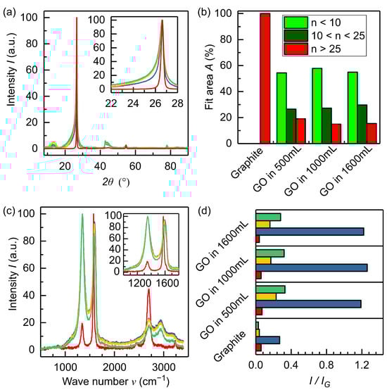 Figure 2a compares XRD measurements on the graphite educt (red) and GO produced with anodic pretreatment in 1 M NaOH during up-scaling at the reactor volumes of 500 mL (blue), 1000 mL (yellow) and 1600 mL (green). The most prominent peak in the diffractogram is the (002) reflex at 26.62°. This peak position indicates a predominant low oxidation degree of the product. [] The educt graphite shows a very sharp peak structure indicating crystallites comprising a vast number of layers. The inset in Figure 2a displays an asymmetric profile in the (002) reflex. The latter indicates a distribution of different layer numbers n present in the powder due to peak broadening with lower layer numbers []. Increased interlayer spacing after the exfoliation and oxidation process caused the slight shift in maximum for both few-layered and multi-layered powder parts to lower diffraction angles leading to asymmetry in the lower diffraction angle direction. The peak structure and its asymmetric profile are in accordance with the literature [].