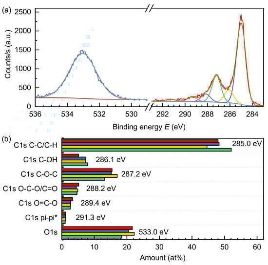 Figure 3a displays XPS spectra of GO powder produced in a 1600 mL reactor (batch I). The spectra exhibits a complex C1s peak (292–284 eV) with multiple peaks and a broad O1s peak (533 eV), which can be fit with a single component. We further analyzed the respective oxygen functional groups on carbon by fitting the C1s spectra according to the literature [,]. Good fitting was achieved with six gaussian functions, indicating C-C/C-H, C-OH, C-O-C, O-C-O/C=O, O=C-O and pi-pi* carbon species. Figure 3b summarizes the deconvoluted XPS data of a graphene oxide powder produced in a 500 mL reactor and three graphene oxide powders produced in a 1600 mL reactor. Figure S3 in the Supplementary Materials depicts the fitted data of the respective C1s peaks for all materials.