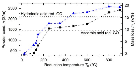 Figure 4 displays powder conductivity and mass loss of GO as a function of the reduction temperature . While the temperature increases, GO is reduced and functional groups start to decompose, enhancing powder conductivity. In detail, the first jump in appears at about 200–250 °C after reduction of about half of the functional groups (about 12.5 w%). This indicates that decomposition of functional groups (e.g., ethers) restores the aromatic backbone and significantly elevates conductivity. Reduction until 600 °C results in a smaller increase in conductivity despite decomposition of an additional 5 w%. A further increase of the reduction temperature results in a second step in conductivity. The increase in mass loss during the final step is smaller (about 2.5 w%). It corresponds to the reduction of the last functional groups deteriorating the conductivity of the powder, achieving almost full reduction at 20 w% mass loss. Hence, in summary, the thermal reduction proceeds initially via ether groups, and then it continues via edge groups with increasing temperature. The overall mass loss is in full agreement with the oxygen content measured with XPS.