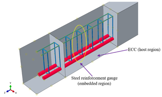 The embedded constraint was used to model the perfect bond between ECC and the reinforcements in the interaction between steel reinforcement and ECC (Figure 5). Steel reinforcement bars are employed as embedded regions in this constraint, whereas ECC serves as the host region. The influence of bond–slip is ignored in the embedded region modeling method, and it is considered when determining the tensile stiffening behavior of concrete [35,36,37].