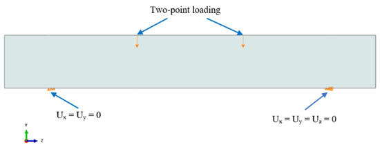 Modeling boundary conditions similar to experiments is essential to achieve close predictions with the experimental results. In the experiments, simply supported boundary conditions were employed with roller support at one of the ends (Ux, Uy) and a hinge at the other end (Ux, Uy, Uz). The loads were inputted as the vertical displacement at the two loading points. The loading and boundary conditions are displayed in Figure 6.