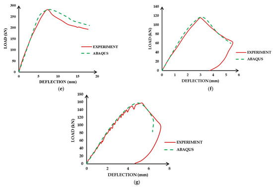 In Figure 9, we present the results for the relationship between the load–deflection obtained from the simulation for seven beam setups adopted from previous works.