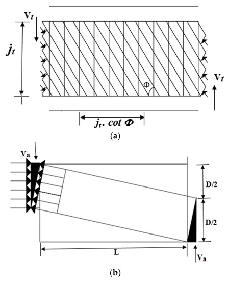 The AIJ A-method [41,42] was accustomed to forecasting the ultimate shear load-carrying capacity of the ECC beams, which was then compared with the experimental load-carrying capacities from prior investigations. The original models were based on the plasticity hypothesis, which states that shear capacity can be depicted by superimposing truss and arch mechanisms. The employed mechanisms and the equations for predicting the ultimate shear load-carrying capacity from the adopted method follow Figure 11 and Equation (3).