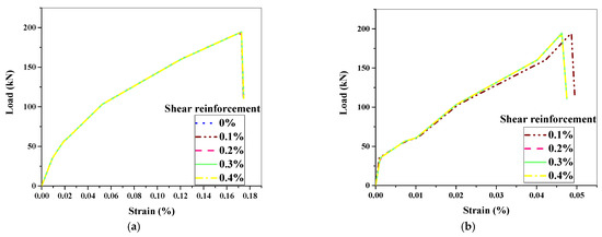 The load–strain response of longitudinal bars was seen and monitored at mid-span using the simulation of beams. The typical load–strain response of the longitudinal main bars is shown in Figure 13a. Furthermore, the highest strain at ultimate load was 0.18 percent, indicating that the longitudinal main bars yielded, as Zhang et al. [20] stated. Furthermore, the strains at maximal load in all stirrups were measured, and they were determined to be 0.10 percent, indicating that the stirrups did not yield due to flexure. Figure 13b depicts a stirrup’s typical load–strain response. From the above-mentioned observations, it is worth noting that the beam specimens underwent flexure-dominated shear and attained failure, unlike pure shear failure, as demonstrated by Sunaga et al. [43], comprising diagonal tension and stirrup yielding.