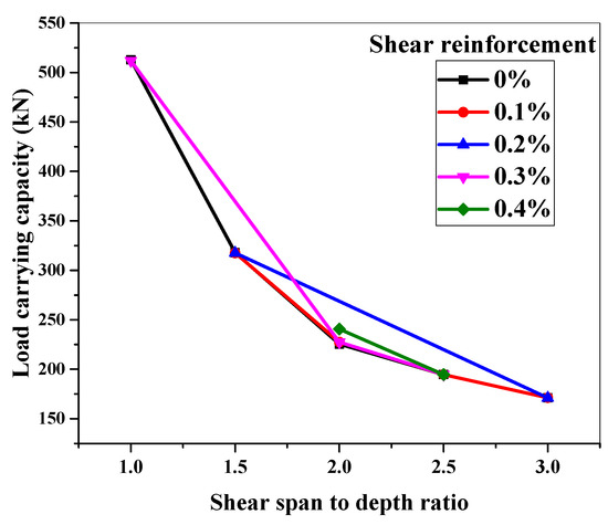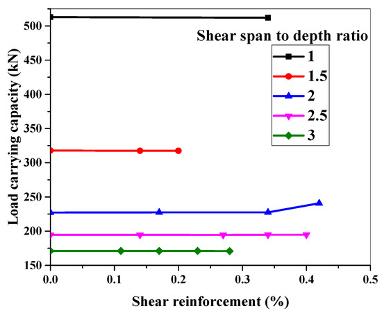The shear behavior of the ECC beam is explored in this section for various a/d ratios against a specific shear reinforcement ratio. Figure 12 shows the adopted cross-section, a/d ratios, and shear reinforcement details for this experiment. Details of the ECC beam’s geometry are shown in Figure 12. The load-carrying capacity of the simulated ECC beams with an a/d ratio of 1 to 3 is shown in Figure 15.
