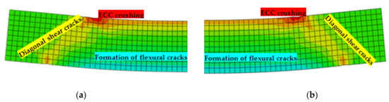 In this section, the crack pattern and the mode of failure for the beams used in the parametric study are discussed. It was noted that all beams failed with flexure-dominated shear failure. Figure 16a,b compare the plastic strain obtained from the FE analysis for S-1 (without stirrups) and S-2 (with stirrups) beam specimens, respectively, used in the parametric study. It was observed that at earlier stages, the cracks propagated in the vertical direction and as increases in load occurred, the inclined shear cracks started to appear. Finally, the failure occurred due to the crushing of ECC in diagonal cracks and in the compression zone. In addition, the number of stirrups did not have any significant effect on the crack pattern and the mode of failure. Similar behavior was achieved for all the beams.