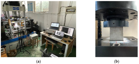 Different strain rate intervals correspond to different dynamic response effects. In this paper, the compressive dynamic performance of concrete after high temperature was studied. Specifically, the dynamic action of seismic response magnitude was selected (the corresponding strain rate interval is 10−3/s~10−2/s), and accordingly, the test strain rates in this paper were set to be 10−5/s, 10−4/s, 10−3/s and 10−2/s, respectively, where 10−5/s refers to the static loading strain rate. The working condition was set as the static reference working condition [25]. The loading process can be divided into two steps. The first step is preloading: the load control method was used to load and unload the test specimen three times in order to control the influence of the gap between the loading surface of the equipment and the surface of the test specimen on the test results. The second step is formal loading: the displacement control loading method was used to load the test specimen according to the above-mentioned strain rates, and the loading stopped after the specimen was broken. In view of the conditions of the equipment used and the setting of the concrete specimen size in reference to the relevant literature, the specimen size was set as 70.7 mm × 70.7 mm × 70.7 mm.