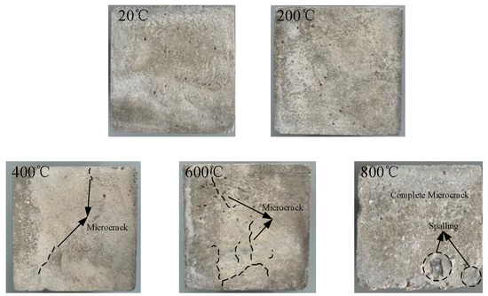 In order to control the high temperature cracking or spalling of the test specimens during the temperature elevation process, all the specimens were dried in advance before the high temperature treatment to prevent high moisture content from causing cracking and spalling. Therefore, in this paper, no specimen burst or spalled during the temperature elevation process. High-temperature cracking and spalling is mainly due to the thermal stress and steam pressure caused by the action of inconsistent internal and external pressure. The phenomenon produced in this paper is the chemical reactions in the cement mortar and coarse aggregate under the action of high temperatures and their uneven deformation to produce damage and cracking. High temperatures can lead to cracking damage or bursting and spalling of test specimens, both having a significant effect on the deterioration of the mechanical properties of concrete.