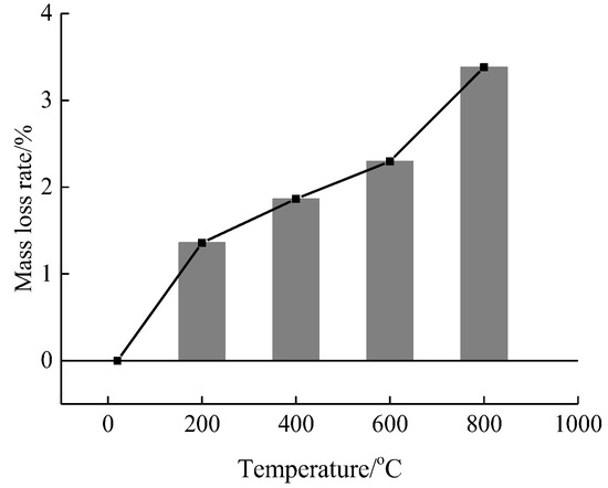 According to Figure 3, when the temperature is 20 °C, the concrete surface presents a gray-brown color. When the temperature is raised to 200 °C, the color of the concrete surface does not change significantly after rapid cooling treatment. When the temperature is raised to 400 °C, the concrete surface presents a light yellow color after rapid cooling treatment, and there exist one or two micro cracks on the surface. When the temperature is raised to 600 °C, the yellow color of the concrete surface becomes more obvious after rapid cooling treatment, and there are more micro-cracks distributed on the surface. When the temperature is further raised to 800 °C, the concrete surface becomes gray-white after rapid cooling treatment, with distribution of crack networks on the surface accompanied by a small number of broken fragments and spalling of the edges. Compared with the morphology of concrete under natural cooling after the action of high temperature as reported in the literature [26,27], the cracks formed under rapid cooling are relatively more obvious. As the test specimen will be cooled down when it encounters water after high temperature, an obvious temperature gradient will be formed from the outside to the inside, and the resulting temperature stress will make the cracks formed on the inner surface different from that under natural cooling. The mass loss rate of the test specimens after rapid cooling treatment under different high-temperature conditions was then obtained and analyzed, as shown in Figure 4. According to Figure 4, the concrete mass loss rate is 1.39% when the temperature is 200 °C, 1.86% when the temperature is 400 °C, 2.30% when the temperature is 600 °C, and 3.38% when the temperature is 800 °C. With the rise of temperature, the mass loss rate is gradually increased. Compared with the mass loss rate under natural cooling as reported in the literature, the mass loss rate under rapid cooling is relatively higher, mainly due to the larger temperature gradient formed by rapid cooling, which makes the test specimens more prone to spalling and therefore mass loss.
