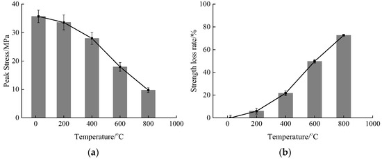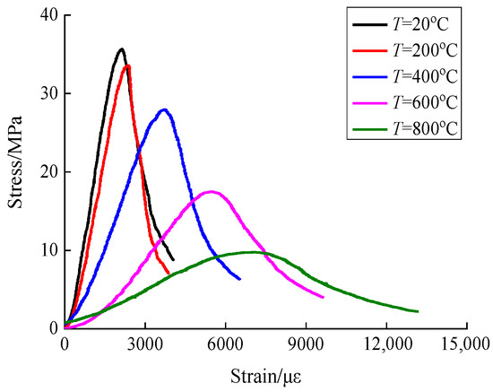 According to Figure 6, the compressive stress value of concrete is 35.69 MPa at 20 °C, and 33.58 MPa, 27.96 MPa, 17.94 MPa and 9.77 MPa at the temperatures of 200 °C, 400 °C, 600 °C and 800 °C, respectively. Compared to the room temperature condition, the compressive stress is reduced by 5.91%, 21.66%, 49.73% and 72.63%, respectively. From the overall trend analysis, it can be seen that with the rise of temperature, the compressive stress is gradually reduced. When the temperature exceeds 400 °C, the decrease in compressive stress due to temperature is significantly increased. Compared with the decrease in compressive stress under natural cooling as reported in the literature [28,29], the decrease in compressive stress under rapid cooling is relatively higher due to the temperature effect. The main reason is that the concrete is affected more significantly by the temperature gradient under the high-temperature rapid cooling mode and the initial damage of concrete is relatively higher, so that its compressive stress is lower than that under natural cooling under the influence of temperature.
