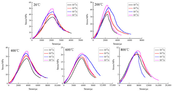 From the analysis of Figure 15 and Figure 16, when the temperature is 20 °C and the strain rate is in the range of 10−5/s~10−2/s, the compressive peak strain of concrete is in the range of 2037~2166 με, indicating a changing range of −2.08−5.96%. When the temperature is 200 °C, the compressive peak strain is in the range of 2312~2514 με under different strain rates, indicating a changing range of −1.91~6.66%. When the temperature is 400 °C, the compressive peak strain is in the range of 3556~3726 με under different strain rates, indicating a changing range of −0.64−4.56%. When the temperature is 600 °C, the compressive peak strain is in the range of 5549~5668 με under different strain rates, indicating a changing range of 1.12%~4.02%. When the temperature is 800 °C, the compressive peak strain is in the range of 7037~7454 με under different strain rates, indicating a changing range of 2.25~5.93%. From the overall trend analysis, as the temperature increases, the compressive peak strain of concrete is gradually increased and the plastic deformation capacity of concrete is gradually improved.