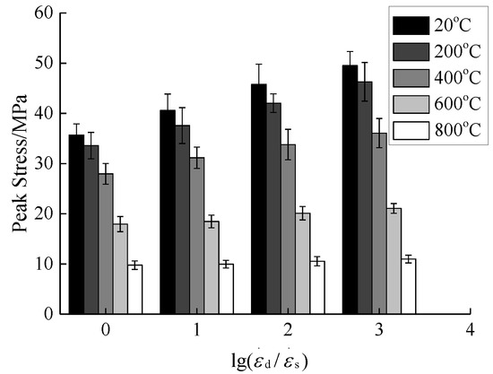 According to Figure 10, when the temperature is 20 °C, the compressive stress is increased from 35.69 MPa at the static strain rate of 10−5/s to 49.50 MPa at the strain rate of 10−2/s, indicating an increase by 38.69% due to the strain rate. When the temperature is 200 °C, the compressive stress is increased from 33.58 MPa at the static strain rate of 10−5/s to 46.29 MPa at the strain rate of 10−2/s, indicating an increase by 37.85% due to the strain rate. When the temperature is 400 °C, the compressive stress is increased from 27.96 MPa at the static strain rate of 10−5/s to 36.07 MPa at the strain rate of 10−2/s, indicating an increase by 29.01% due to the strain rate. When the temperature is 600 °C, the compressive stress is increased from 17.94 MPa at the static strain rate of 10−5/s to 21.07 MPa at the strain rate of 10−2/s, indicating an increase by 17.45% due to the strain rate. When the temperature is 800 °C, the compressive stress is increased from 9.77 MPa at the static strain rate of 10−5/s to 10.98 MPa at the strain rate of 10−2/s, indicating an increase by 7.78% due to the strain rate. In the relevant literature [30,31], the mechanical properties of ordinary concrete under low to medium strain rates (10−5/s~10−2/s) under compressive stress have been investigated. Compared with static conditions, the compressive stress is generally increased by 30% to 40% by the strain rate. In this paper, the increase in compressive stress affected by the strain rate under normal temperature conditions is consistent with the references above, but there are some differences in the increasing range among different reports, which are mainly related to the randomness and discreteness of concrete materials. Bi et al. [19] used Hopkinson bars to conduct a dynamic stress study on concrete under natural cooling and rapid cooling under high strain rate conditions, and reported that the increase in compressive stresses under rapid cooling was higher than that under natural cooling. The literature [32] reviewed the coupling effect of high temperature and high strain rate on the dynamic properties of concrete under natural cooling, and the results showed that when the temperature exceeded 400 °C, the compressive stress was increased by the strain rate and decreased significantly and gradually. Based on the analysis above, it can be seen that, after the same temperature treatment, the compressive stress value is gradually increased as the strain rate increases. The increase in temperature makes the concrete compressive stress affected by the strain rate increase significantly and gradually decrease. When the temperature exceeds 400 °C, the compressive stress is significantly reduced by the strain rate. Temperature and cooling methods have obvious effects on the compressive performance of concrete. Due to the large temperature gradient generated by the rapid cooling method and higher temperature, the compressive stress of concrete is affected by the strain rate. Ultimately, the increase in the compressive stress of concrete affected by the strain rate is relatively insignificant compared to the natural cooling method and the normal temperature method.