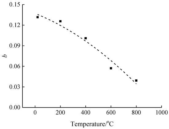 According to Figure 11, Equation (2) proposed in this paper can well describe the relationship between the compressive stress dynamic increase factor and strain rate of concrete after different high temperature and rapid cooling treatments. The parameter b tends to decrease gradually with the rise of temperature, thus indicating from a quantitative point of view that the concrete dynamic increase factor is gradually reduced by the strain rate as the temperature increases. This is consistent with the qualitative conclusion. In order to illustrate the coupling effect of strain rate and temperature on the dynamic increase factor, the parameter b was expressed quantitatively with temperature T and the expression form as shown in Figure 12 was obtained.