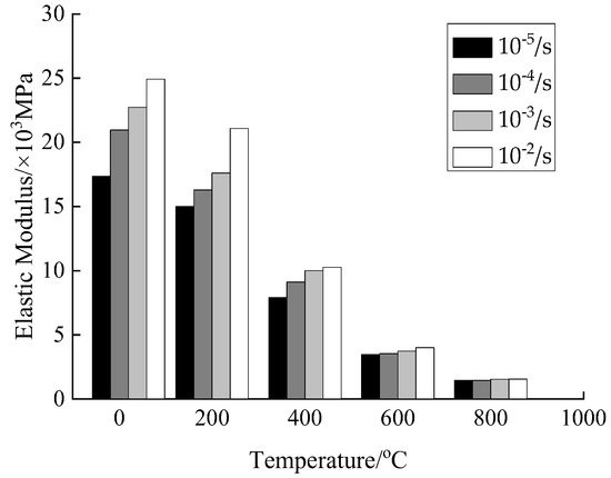 According to Figure 13 and Figure 14, when the temperature is 20 °C, the elastic modulus of concrete is increased from 17.34 × 103 MPa at the strain rate of 10−5/s to 24.92 × 103 MPa at the strain rate of 10−2/s, indicating an increase by 43.67% affected by the strain rate. When the temperature is 200 °C, the elastic modulus is increased from 15.00 × 103 MPa at the strain rate of 10−5/s to 21.08 × 103 MPa at the strain rate of 10−2/s, indicating an increase by 40.53% affected by the strain rate. When the temperature is 400 °C, the elastic modulus is increased from 7.90 × 103 MPa at the strain rate of 10−5/s to 10.26 × 103 MPa at the strain rate of 10−2/s, indicating an increase by 29.84% affected by the strain rate. When the temperature is 600 °C, the elastic modulus is increased from 3.47 × 103 MPa at the strain rate of 10−5/s to 4.01 × 103 MPa at the strain rate of 10−2/s, indicating an increase by 15.60% affected by the strain rate. When the temperature is 800 °C, the elastic modulus is increased from 1.46 × 103 MPa at the strain rate of 10−5/s to 1.55 × 103 MPa at the strain rate of 10−2/s, indicating an increase by 6.1% affected by the strain rate. In the relevant literature [20,25,26], research has been carried out on the elastic modulus of ordinary concrete at low and medium strain rates (10−5/s~10−2/s). Compared with static conditions, the elastic modulus of concrete is generally increased by 25–45% affected by the strain rate. In this paper, the changing range of the elastic modulus affected by the strain rate under normal temperature conditions is consistent with this interval. As the concrete deformation parameters are influenced by the material randomness, it leads to a more discrete variation of the elastic modulus affected by the strain rate.