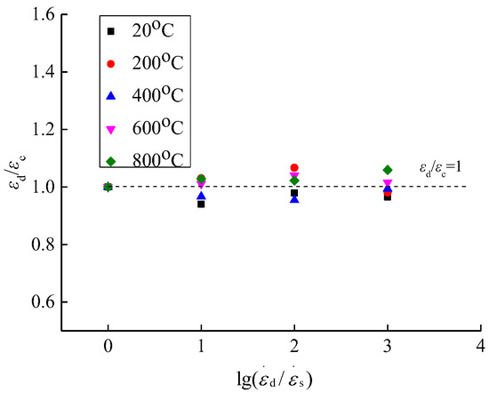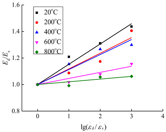 In order to examine the relationship between the elastic modulus of concrete affected by the strain rate after different high temperatures and rapid cooling treatments, the same method as the dynamic increase factor of compressive stress was used in this paper to analyze the elastic modulus, that is, to define the change factor of the elastic modulus Ed/Es (Ed is the elastic modulus under the dynamic strain rate and Es is the elastic modulus under the static strain rate). Thus, the expressions as shown in Figure 13 and Figure 14 were obtained.