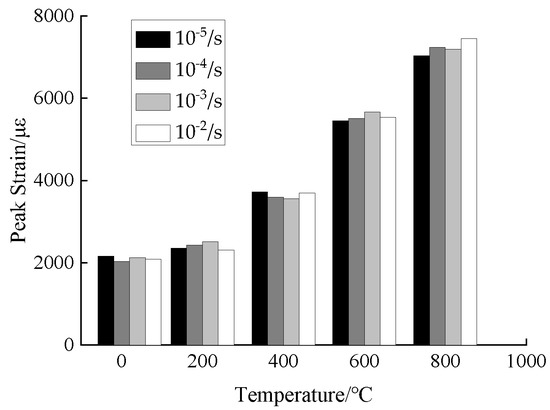 The peak strain was extracted from the compressive stress-strain curves of concrete under different temperatures and strain rates, and the effects of temperature and strain rate on the peak strain of concrete were analyzed, as shown in Figure 15 and Figure 16.