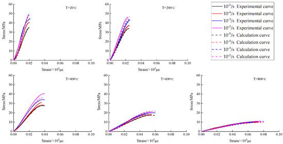 The concrete compression test under the strain rate of 1.0 × 10−5/s is considered as a quasi-static test, and the model parameters are fitted using Matlab. Under the same temperature, the stress corresponding to the same strain on the stress-strain curve at the strain rates of 1.0 × 10−4/s, 1.0 × 10−3/s and 1.0 × 10−2/s was extracted. By eliminating the material pure elastic response term E0ε + αε2 + βε3 in Equation (17), Equation (18) was obtained. Fitting parameters E1, θ1, then substituting E1, θ1 into Equation (17) and using the stress-strain curve in the quasi-static test to fit the parameters E0, α and β, the expression form of Equation (18) can be obtained.