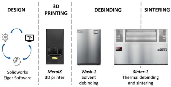 Pure copper parts were fabricated using the Markforged equipment, that englobes a 3D metal printer (MetalX), a washing machine which works with dissolvent (Wash1) and a tubular furnace with a tight temperature control between room temperature and 1300 °C (Sinter1). Figure 2 shows the equipment that have been used and the manufacturing process which has been followed in this work.