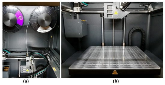 The first stage consists of the 3D printing of copper specimens using the MetalX 3D printer, which allows a manufacturing volume of 300 × 467 × 1120 mm3, and a layer thickness between 50 and 125 µm. Figure 3 shows in detail the 3D printer that has been used in this study. This equipment works with two different filaments: the metal filament of interest, in this case of copper, and a ceramic filament, which is used to build the auxiliary supports if these are needed during the printing process. The metal and ceramic filaments are carefully located in their specific coil at the upper printer cavity (Figure 3a), which is thermally controlled in the suitable conditions for the raw materials. The print head with double extruder (metal and ceramic) and the print bed are situated inside the printing chamber (Figure 3b), which is also heated during the manufacturing process. The solvent debinding process is carried out in the washing equipment, which has a work volume of 356 × 254 × 203 mm3. For the final thermal debinding and sintering stages, a tubular furnace is used, which can heat up at a maximum temperature of 1300 °C and has a controlled atmosphere reaction chamber, whose volume is 18,356 cm3 (145 mm in diameter and 1112 mm in length).