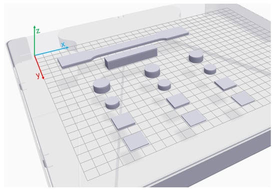 The manufacturing process starts with the CAD design of the geometry of the copper part to be printed, using computer assisted design software (Solidworks, in this case). When the CAD model is done, Eiger software is used to divide the model part in the specific layers to be printed on. Another task that the software performs is the oversizing of the part considering the contraction that it will suffer during the sintering process, which depends on the material and the geometry. Eiger software also allows the setting of some parameters for the impression, such as the printing scale, filling type (solid or triangular structure), layer thickness, exterior wall thickness, and the use of rafts to ensure adherence and enhance stability during the 3D printing. The software is useful for setting up the parts orientation on the working platform for the printing; the user should consider the geometry avoiding, as far as possible, extra supports and economizing on the manufacturing process. In general terms, the larger dimension is placed on the X axis, the shorter one on the Y axis and the different layer are printed following the Z axis. The printing strategy followed in each sample is shown in Figure 4. When all the parameters and considerations are selected, it is possible to check the total printing time, the duration of the solvent washing cycle, the approximate cost of the used material, and the printed and sintered parts dimensions. The parameters established for the copper 3D printed parts manufacturing are shown in Table 1.