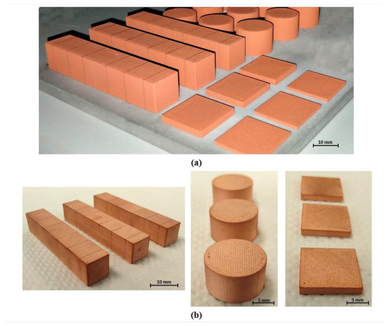 Copper parts with different geometries were manufactured to analyze their geometric and mechanical properties, as well as their electrical and thermal conductivity. Cylindrical and prismatic specimens were processed to analyze the relative density and the volumetric shrinkage after the printing and sintering processes, respectively. In addition, tensile and impact specimens were elaborated according to ISO 2740 [70] and EN ISO 5754 [71] standards, respectively. Moreover, cylindrical copper parts with 15 mm diameter and different thicknesses were used for the determination of thermal conductivity of the MEAM parts, while square-based copper parts were used to evaluate their electrical conductivity.