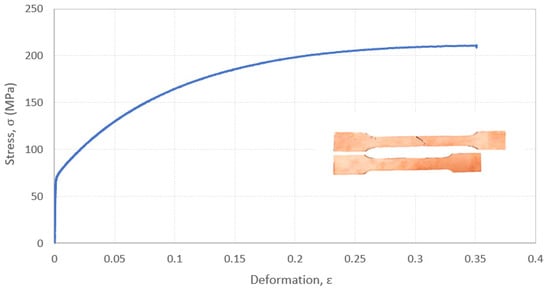 The uniaxial tensile stress-strain curve of an evaluated sintered copper part is shown in Figure 8. The mechanical properties obtained from the different tensile tests were similar and all the samples displayed the same behaviour, which proves a good manufacturing reproducibility. All the tensile curves, including the presented one, include three stages: elastic zone, strain hardening zone and crack propagation zone. In the elastic zone, the stress increases linearly and rapidly until the material started to harden, exhibiting a yielding point at the end of this stage. In the second stage, further stress leads to strain hardening until the ultimate tensile strength is reached. In the third stage the spontaneous and sudden propagation of a crack occurs, after exceeding the highest tensile strength due to the inherent manufacturing process porosity. Note that the stress-strain curve shows in its last stage that copper MEAM samples are very brittle, and their premature fracture is due to the brittleness of the material after hardening, which is induced by the severe propagation of a crack across the pores.