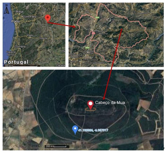 Location of the Cabeço da Mua hematite ore sampling area, Moncorvo. Images obtained from Google Maps.