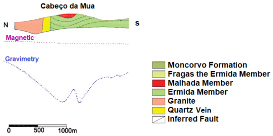 Longitudinal section (N−S) on Moncorvo’s synchlorium with overlapping interpretation of geophysical data. Adapted from [31].