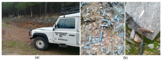 A considerable amount of rock fragments, about 0.5 m of rock, was collected at the surface of the coluvium in a space of one hundred meters to be representative of the materials that emerge in the area. In Figure 3, it is possible to verify the extraction site located in one of the slopes of the Cabeço da Mua. The dispersed rocks were in contact with the chemical and mechanical weathering agents (Figure 3b).