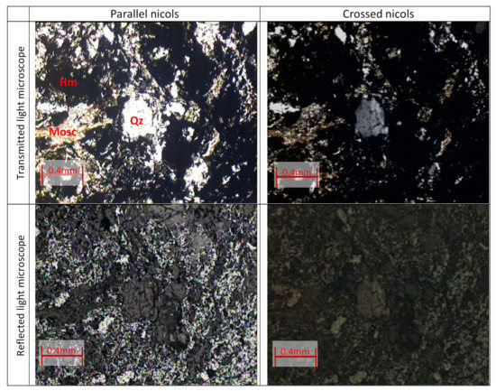 Figure 5 shows four images of the polished surface under a microscope with transmitted and reflected light, in parallel and crossed niches. The mineralogical constitution is composed of quartz showing granular texture, muscovite that gives the rock the lepidoblastic texture, and fine-grained hematite constituting the matrix that becomes opaque in transmitted light microscope and reflective in the microscope reflected light. Thus, the overall texture of the rock is of the granololepidoblastic type and the amount of hematite is about twice as much as quartz.