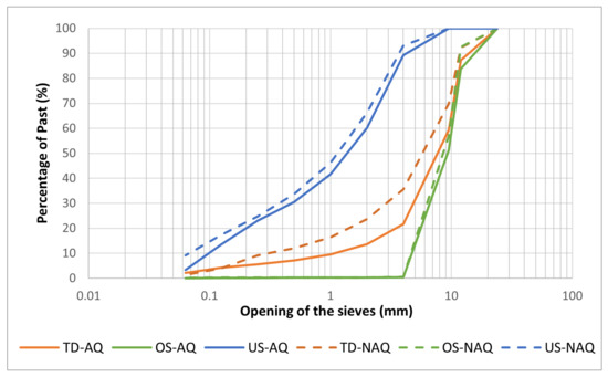 The lots tested in the experiments were undersize (US), total distribution (TD), and oversize (OS). Through particle size analysis, we can conclude that the US lot has 50% of the particle sizes below 1 mm, the OS lot has particle sizes above 9.5 mm, and the TD lot has heterogeneous particle sizes between 9.5 mm and 1 mm. The aggregate density is high, as well as the porosity: TD has 2171 kg/m density and 0.45 porosity, US has 2263 kg/m density and 0.43 porosity, and, finally, OS has 1926 kg/m density and 0.52 porosity.