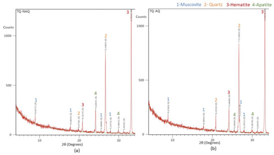 Comparing the XRD and XRF results (Table 2), all iron oxide is hematite. However, XRD values for hematite and quartz are affected by the presence of amorphous, non-silicate materials, such as alumina hydroxides, that do not appear clearly in diffractograms. This also explains the high XRF values of aluminum oxide, comparing with a muscovite amount of 1% in XRD semi-quantification.