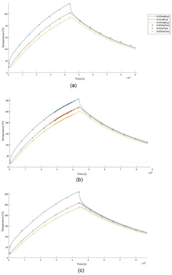Figure 9 show the graphs obtained through Matlab of the heating/cooling cycles. The solid lines represent the experimental temperature curve, and the crosses represent the theoretical temperature curve, returned by the theoretical model, with the best optimization (RMS). The experiments were performed with a combined duration of 12 h heating and 12 h cooling. The thermocouples were placed inside the reservoir with the hematite ore at the following distances: 0.009 m; 0.03 m; and 0.055 m. Inside the insulation, they were placed in its center at the following distances of 0.08 m, 0.11 m, and 0.14 m. Comparing the heating curves of the three lots, you can see that the differences are subtle. All the curves have the same shape, which is predictable because the material is the same. Furthermore, this was also expected, given that this is the normal shape for this type of sensible heat storage. Additionally, Figure 9 proves that the TD material absorbs more heat because although the energy delivered is the same in all experiments, the thermocouples in the TD do not reach the 300 °C temperature as in the other lots, which is caused by the hematite grains absorbing more energy. However, the TD lot also loses temperature faster because it has a higher conductivity than the other lots (Figure 9a). It is the US lot that is able to store heat longer (Figure 9c).