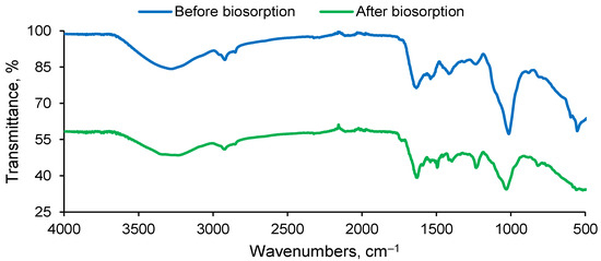 Functional groups of alginate matrix are discernable. Between 3000 and 3200 cm−1, vibrations of hydroxyl can be noted. At 2920 cm−1, the –CH aliphatic stretching vibration is detected [39]. Asymmetric and symmetric vibrations of carboxyl ions appear from 1600 to 1400 cm−1 [40]. C–O (between 1100 and 900 cm−1), mannuronate and guluronate residues (1030 cm−1), and –CH2 bending vibration (1000 cm−1) also confirm the polymer structure [41]. Analogous deductions are presented in other papers [42,43,44], in which beads with alginate as polymeric matrix were prepared. Peaks of 1630 and 1540 cm−1 can be assigned to amide I and amide II. Between 1300 and 1200 cm−1, bands of amide III (proteins) and for PO2− (phosphorylated proteins and phospholipids), which possibly caused by the yeast incorporated into the polymeric material, were noticeable [45]. Thus, it can be concluded that residual biomass of Saccharomyces pastorianus was incorporated in the resulting adsorbent material.