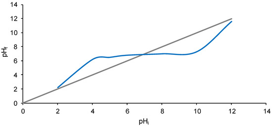 For the determination of the point of zero charge, pHPZC, sodium chloride was used as background electrolyte. The initial pH (pHi) of each NaCl (0.1 M) solution was adjusted between 2 and 12 by small additions of NaOH (0.1 M) or HCl (0.1 M) and measured with a portable pH meter (Dostmann KLH9.1, 0–14 pH, Carl Roth, Karlsruhe, Germany). In each solution (20 mL), 0.4 g of biosorbent was added. After 24 h at room temperature, the final pH (pHf) was measured. The pHPZC was established from the curve pHf = f(pHi).