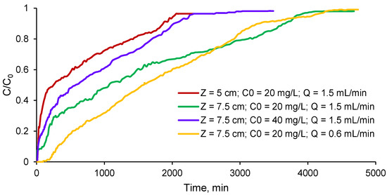Comparable findings, concerning the parameter influences, are reported in other published papers that are dedicated to the removal of various pollutants (including pharmaceutical residues) from aqueous solutions by fixed-bed column adsorption. Kumari et al. [47] studied the process of eliminating fluoride from water with an adsorbent based on sulphuric acid treated alumina and arrived to the conclusion that the fluoride concentration, the bed height and flow rate are important to the defluoridation performance. Aryee and Han [48] investigated the possibility of retaining trimethoprim on a newly prepared biocomposite. Their column adsorption experiments also reveal that parameters such as initial pollutant concentration, bed height, and flow rate strongly influence the adsorption efficiency. Different metals [49,50] were also removed by continuous fixed-bed column adsorption with various adsorbents, and the stated impact of the operating parameters was similar.
