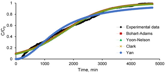 As summarized in Table 2 and depicted in Figure 5, three of the four applied mathematical models, namely Yoon–Nelson, Clark, and Yan, acceptably fit to the recorded experimental data with a degree of accuracy higher than 0.94.
