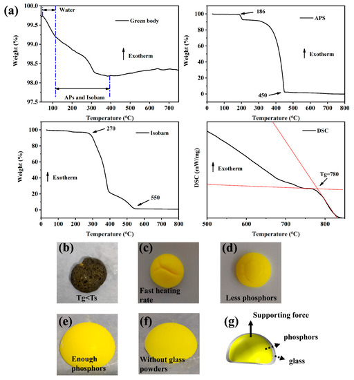 Figure 2a presents the whole process of weight loss of the green bodies of PiGs during sintering, Tg of the glass powders and Ts of APS and Isobam. Tg of the glass powders was 780 °C and Ts of APS and Isobam was about 186 °C and 270 °C respectively. Due to the evaporation of water, there was an obvious weight loss process before 100 °C [26]. The weight loss between 100 °C and 400 °C was due to the gradual elimination of Isobam and APS. This was in accordance with the Ts of Isobam and APS. After 400 °C, the weight of the green bodies did not decrease, which indicated that the organic matter in the PiGs has been removed. It was noteworthy that Tg of the glass powders must be greater than 400 °C. When the Tg is lower than 400 °C, it can affect the discharge of organic matter as shown in Figure 2b. The sintering rate also plays an important role in the preparation of PiGs. When the sintering rate is too fast, a depression displayed in Figure 2c occurs. It was attributed to that the three-dimensional network supporting the green bodies collapsed too fast. This implied that the sintering rate must be controlled slowly in the sintering process. Figure 2d–f exhibit different phosphors contents of PiGs after sintering at the temperature of 800 °C. The problem of PiGs with less phosphors was similar with that in Figure 2c but the shape of PiGs with enough phosphors and without glass powders kept intact. This implied that phosphors played a good role in keeping shapes of PiGs. As shown in Figure 2g, when the glass is in the molten state, the phosphors particles can provide a force to support the glass.