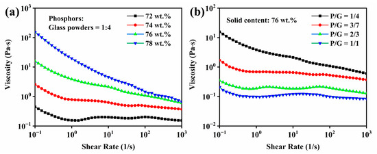 The influences of solid contents and ratios on the viscosity of slurry with 3.0 wt.% Isobam and 1.0 wt.% APS is shown in Figure 3. With the increase of shear rate, all slurry exhibited an obvious shear-thinning behavior. Solid content was the main factor influencing the viscosity of slurry. As seen from Figure 3a, the viscosity of slurry increases when solid content increases from 72 wt.% to 78 wt.%. The viscosity of the slurry was too high to caste when solid content reached 78 wt.%. The changes of viscosities of slurry in the same solid content are displayed in Figure 3b. With the increase of phosphors and the decrease of glass powders, the viscosity decreased continuously. This was mainly due to the fact that the solubility of phosphors was greater than glass powders in water. In addition, it was noticeable that the viscosity of the slurry increases abnormally in some areas. It depended on the two main mechanisms. On the one hand, the agglomeration phenomenon led to viscous slurry [31]. On the other hand, when APS was added into the slurry, the electrostatic repulsion between particles would increase and then the viscosity decreased [30].