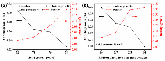 (a) The shrinkage ratios and densities of green bodies with different solid contents and (b) ratios of phosphors and glass powders.