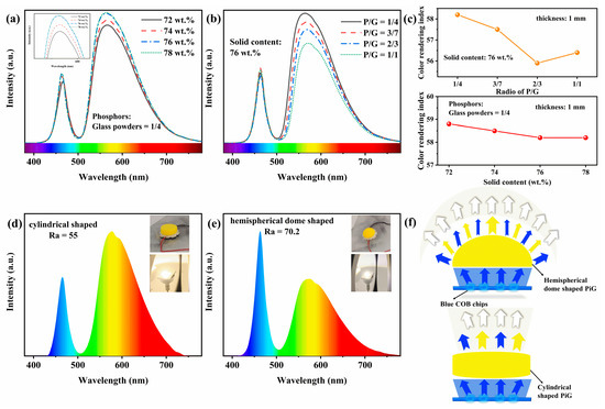 Figure 6a,b illustrate the electroluminescence (EL) spectra of PiGs with different solid contents and ratios. Spectral intensity increased with increasing solid content in the same ratio. The intensity of yellow lighting increased with increasing solid content from 72 wt.% to 78 wt.% at the same ratio. The increase in density increased the effective conversion efficiency of phosphors to blue light [8]. When the solid content was remained at 76 wt.%, an increase of phosphors and a decrease of glass powders led to a reduction in the intensity of yellow intensity. It was mainly attributed to the weakening of transmittance. This was very understandable that the transmission rate was bound to decrease significantly when the phosphors increased and the glass powders decreased. Solid content and ratio of phosphors and glass powders have little effect on the color rendering index (CRI) of PiGs, as seen in Figure 6c. However, Figure 6d,f represent that the change in shape of PiGs is a huge improvement on CRI. The CRI of cylindrical and hemispherical dome-shaped PiGs were 55 and 70.2 respectively. After changing the shape from a cylinder to a dome, the CRI of PiGs was increased by around 27%. The cause of this resided in the change in shape. This resulted in changes in the transmissive capability of PiGs. It was also implied by the EL spectra shown in Figure 6d,e. Then, this would optimize the ratio between blue light and yellow light to produce a better quality of white light as displayed in Figure 6f.