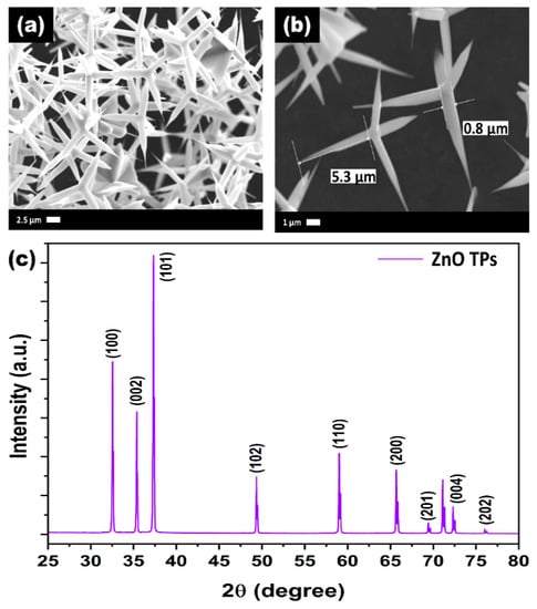 SEM images (a,b) and XRD spectra (c) of ZnO TPs.