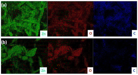 EDX mapping of ZnO TPs/chitosan (a) and ZnO TPs/Nafion (b). Green color represents zinc, red is oxygen, and dark blue is carbon.