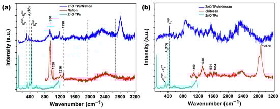 Raman spectroscopy is a very useful and efficient technique for determining the chemical composition of materials. In the present study, Raman spectroscopy was used to confirm ZnO TPs wurtzite structure as well as to compare spectra of ZnO TPs and ZnO TPs/chitosan, and ZnO TPs/Nafion samples. Figure 3a,b show Raman spectra of the above-mentioned samples, where the lower (light green) curve in both graphs represents the Raman spectrum on ZnO TPs with several (, A1(TO), ) peaks that correspond to ZnO wurtzite structure []. The middle (red) curve in Figure 2b represents the Raman spectrum of Nafion with several vibration peaks (950, 1020, 1216 and 1290 cm−1) that correspond to previously proposed Nafion spectra []. Peaks at 950 cm−1 indicate the C-O-C symmetric stretching, while peaks at 1226, 1290 cm−1 are contributed by C-F2 and C-C degenerate stretches, respectively []. The Raman spectrum of the ZnO TPs/Nafion composite sample shows some artifacts of both materials, but with modifications, including the appearance of an intense peak at 2807 cm−1, which may correspond to C-H stretching.