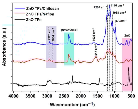 FTIR spectra of ZnO TPs, ZnO TPs/Nafion, and ZnO TPs/chitosan samples.
