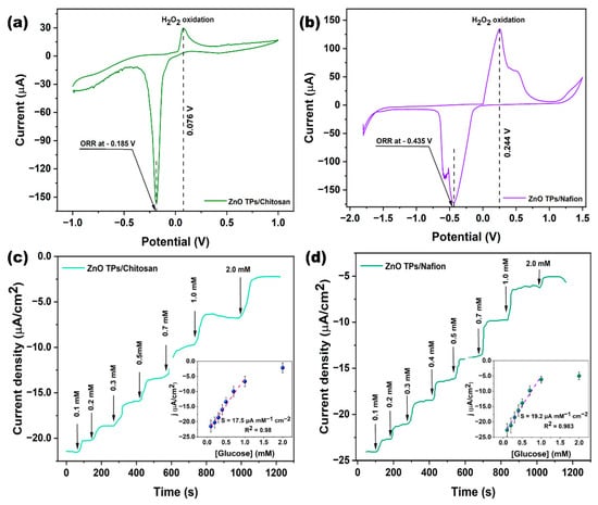 CV curves of ZnO TPs/chitosan (a) and ZnO TPs/Nafion (b) measured in PBS solution consisting of 0.3 mM of glucose. Glucose detection performances on ZnO TPs/chitosan (c) and ZnO TPs/Nafion electrodes (d). Measurements were carried out in electrochemical cell at applied potential −0.185 V for the ZnO TPs/chitosan electrode, and at −0.435 V for the ZnO TPs/Nafion electrode.